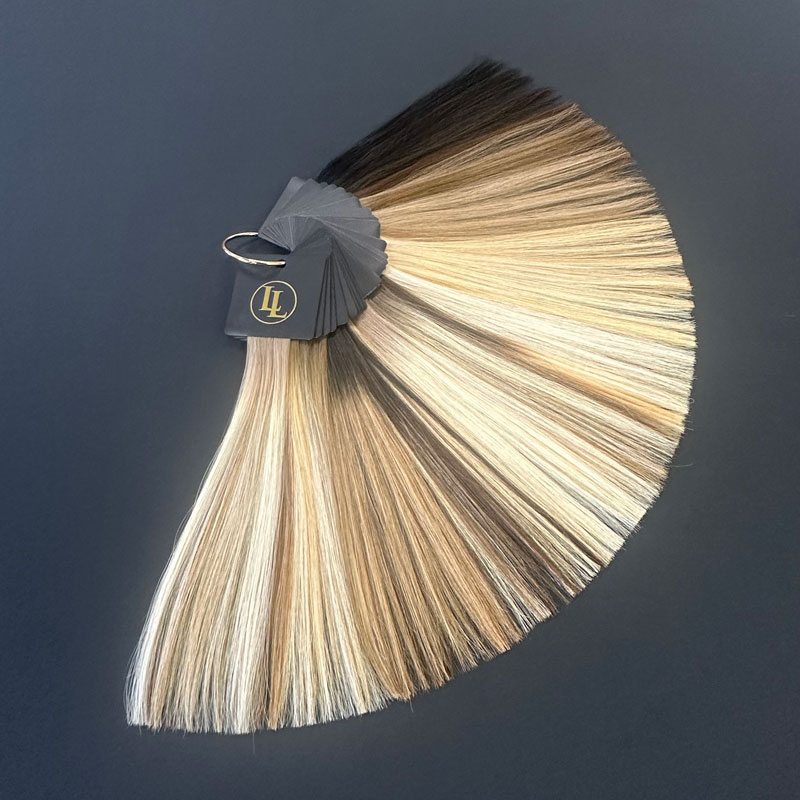 For color matching, use the ends of the hair where the extension will lay. Twist the swatches together, spread them out and show your client what the color combination can look like as you express your creative freedom.